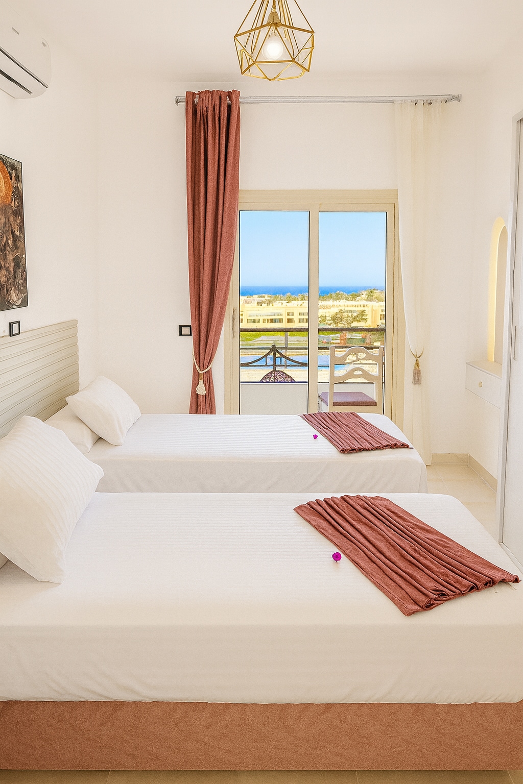 Amazing apartment with giant roof terrace, View above all pool, garden, and sea view. Master bedrooms have own bathroom, and Terrace in front. Free 4 x sunbed for beach, and free pool area☀️🏖️ Water, electricity bed sheet and some towels inkluding in the rent. Safe Way marked open 24/7 ( small super marked ) Soho 5 min 🚕 InDrive from 80 LE 10 min Nabq 🚗 10 min Airport ✈️ 15 min Naama bya, InDrive from 150 LE 25 min Old market, InDrive from 200 LE