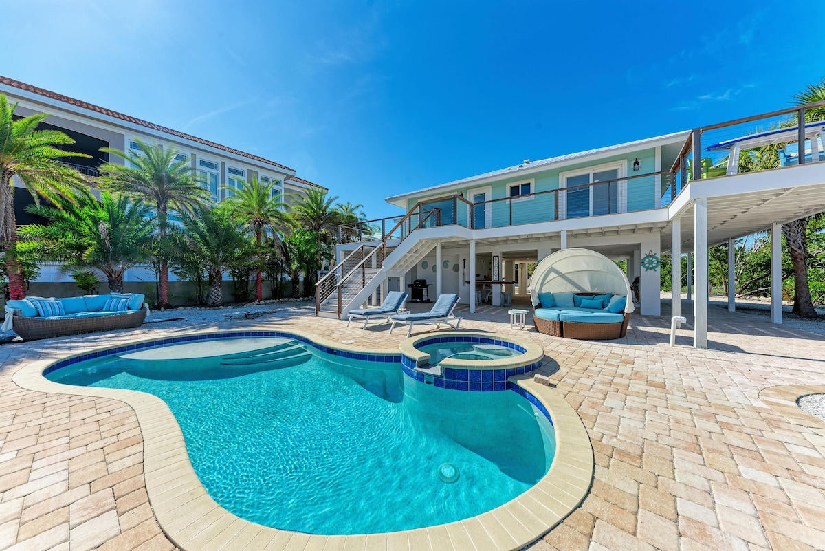 Welcome to Golden Girl. Our 3 bedroom 2 bath home is totally renovated with all new furniture. A 2nd level observation deck, private hot tub, bunkroom sleeps 6, two bdrms with kings, queen sleeper sofa in LR, laundry, high speed WIFI, all new appliances, smart TV's, so much more! Lanai opens up to semi private beach and a quiet neighborhood of single family homes. There is Bay access too. Kayaks available for rent. There is a separate apartment above not included. The location cannot be beat!