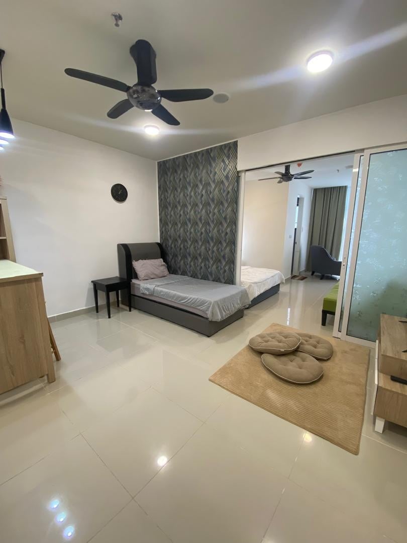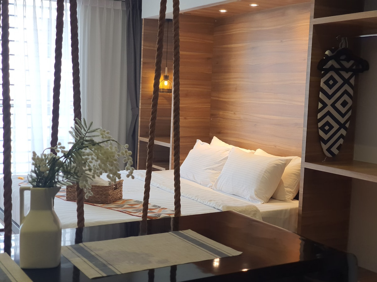 Studio (na may tanawin ng balkonahe at hardin) Matatagpuan malapit sa paliparan ng Kota Kinabalu 5 minutong biyahe ang layo mula sa Tanjung Aru beach 10 minutong pagmamaneho papuntang sentro ng lungsod ng KK TV na may mga Astro channel WiFi Plantsa at plantsahan Kettle Refrigerator Kusina, kalan, kawali, spatula, sangkalan, kutsilyo, pinggan at kubyertos 1 king - sized na higaan Buksan ang kabinet para mapagsabitan ng mga damit Washroom : Water heater, Body & hair shampoo, Toilet rolls Mga Common Area Gym Room : Antas 7 Hardin : Antas 5