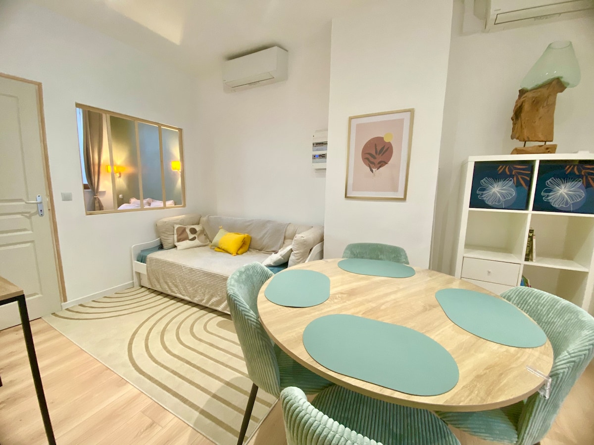 Maligayang pagdating sa aming bagong tuluyan, na matatagpuan sa sentro ng lungsod. Nag - aalok sa iyo ang kaakit - akit na bagong ayos na T2 na ito ng tahimik at maliwanag na setting para sa iyong pamamalagi. Nilagyan ng pribadong terrace at canopy, naliligo ito sa malambot na kalinawan na nagbibigay - liwanag sa bawat tuluyan. Tangkilikin ang mainit na kapaligiran at kaginhawaan na inaalok ng pambihirang accommodation na ito. Mag - book ngayon at magkaroon ng natatanging karanasan sa isang lugar kung saan magandang maging komportable.