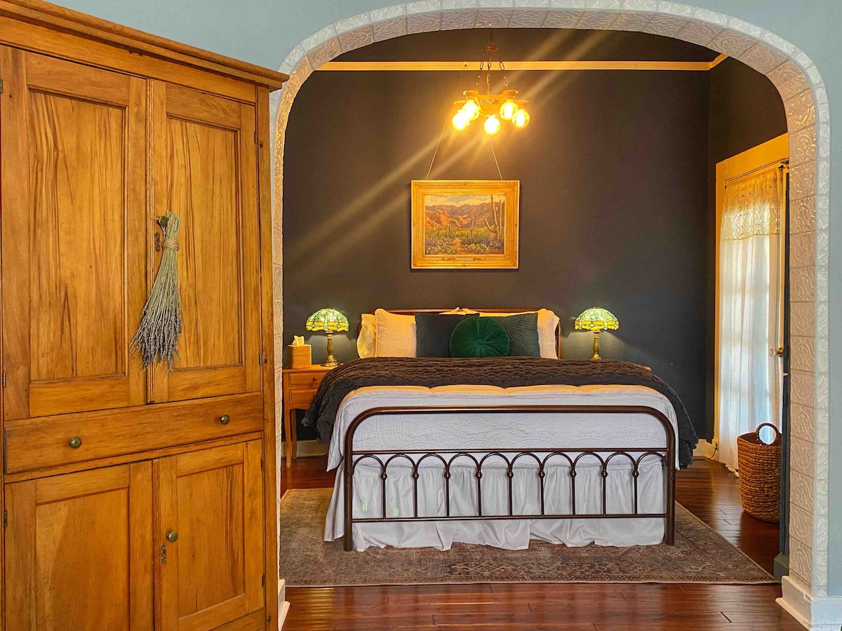 Napanatili nang maganda ang 1920's Craftsman Bungalow sa makasaysayang, ligtas at maaliwalas na kapitbahayan ng Dunbar Spring. Tahimik pero nasa sentro, malapit sa Stone Ave/4th Street, 5–10 minutong lakad o biyahe papunta sa downtown, UA, 4th Ave, mga tindahan, magagandang restawran, at marami pang atraksyon sa Tucson. Maluwang na sala, king at queen na silid - tulugan, kumpletong kusina at nakakaengganyong mga lugar sa labas. Magkape sa malaking balkonahe at pagmasdan ang mga ibon. Maraming libreng paradahan sa kalye sa harap ng bahay.