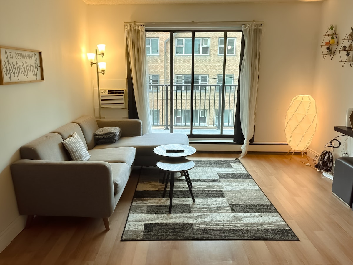 Modern and cosy, 12th-floor suite offers floor-to-ceiling windows, a private balcony, a smart TV, Wi-Fi and in-suite laundry. 🅿️ COVERED PARKING INCLUDED! Security and cameras in elevators and hallways. 📌 We do not have control over the parkade. Steps to Jets Arena, Historic Exchange District, Portage Place, The Forks, etc. Skywalk to Merchant Kitchen and Tim Hortons. For medical professionals or guests visiting loved ones, the Health Sciences Centre is just minutes away.
