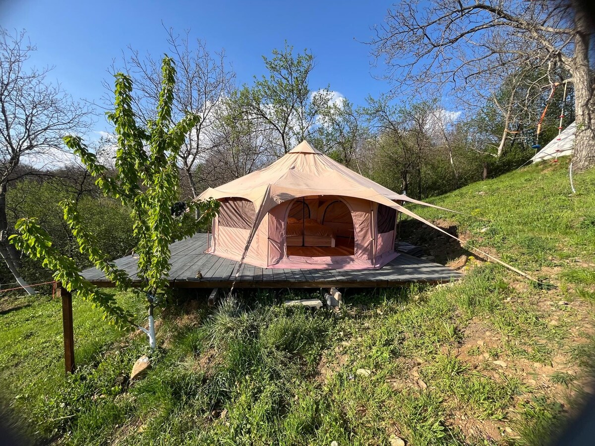 Ang aming piraso ng Langit ay disenyo para mag - alok sa iyo hindi lamang ng akomodasyon, kundi isang ganap na natatanging karanasan. Ang pananatili sa aming lugar ay magbibigay sa iyo ng pakiramdam ng isang tree - house, ang kapayapaan ng isang cabin ng kahoy, ang tanawin ng isang cabin sa bundok, ang intimacy ng kakahuyan, ang kaligayahan ng aming dalawang kasama na aso sa bundok ng Bernese, ang kalakal at espasyo ng isang camper van na may mainit na tubig, init at kuryente. Sa aming complex na 2 bahay: piraso ng Langit at Pangarap, ikaw ay nasa grid ngunit nasa sementado
