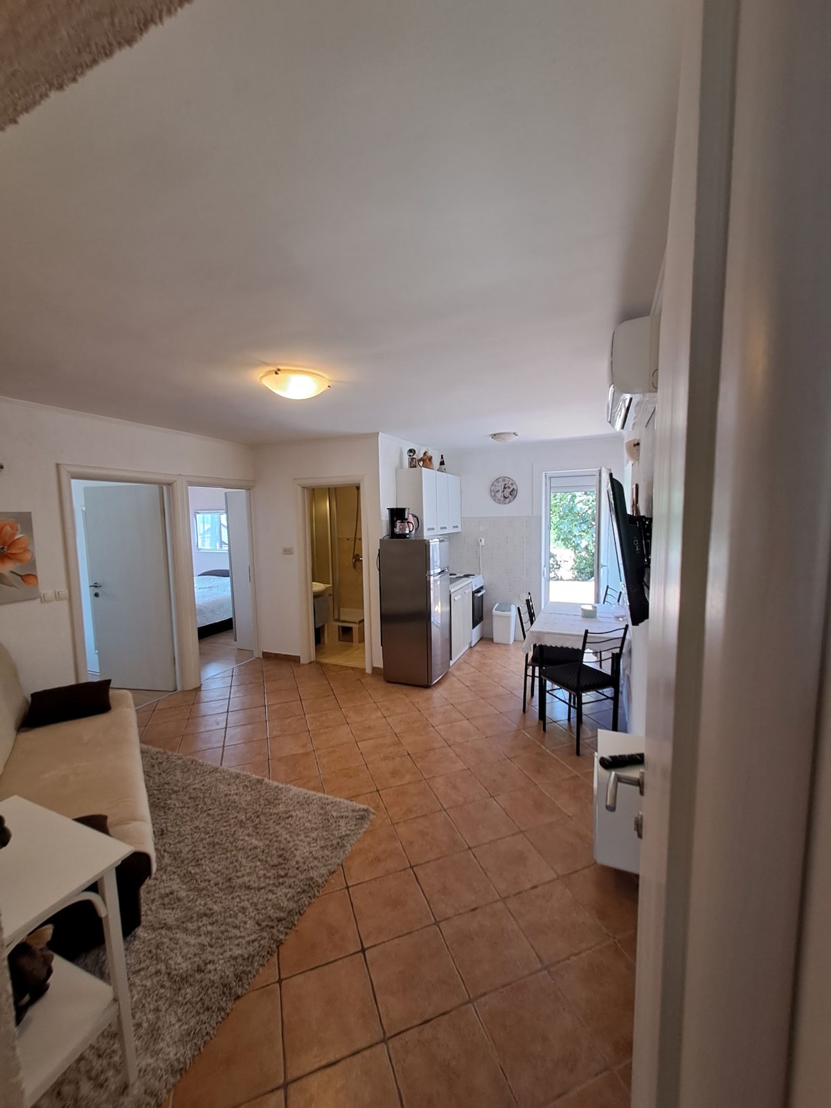 Capacity 2+2, size 42 m2, with a large fenced yard and a swimming pool. Located on the ground floor in a family house in a quiet street; newly built and is fully equipped and furnished. The house is surrounded by trees and offers an unobstructed view of the sea. Pets are not allowed, nor is smoking in the apartment. It is accessible for disabled. Heated pool (May-October) : 8x4m, depth 1,5m. Sat TV, WiFi, A/C, safe, parking, fireplace/grill, terrace, deck chairs and a parasol by the pool.