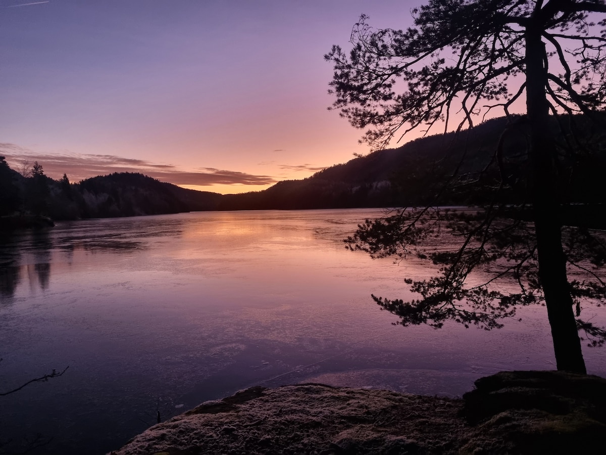 Welcome sa Gåsvannshytta, isang tagong hiyas na 30 minuto lang mula sa Kragerø. Tahimik at liblib ang cabin dahil sa barrier road kaya talagang magiging payapa ang pamamalagi mo. Magdala ng inuming tubig (may 20 litro sa cabin). Ang refrigerator, freezer at kalan ay pinapagana ng gas. Ilaw at pag-charge gamit ang 12V solar panel system. Fireplace na may libreng kahoy na panggatong. Kasama na ang bangka—magdala ng sarili mong life jacket. Libreng pangingisda ng trout at perch. Magagandang oportunidad para sa pagpili ng berry at kabute sa panahon. Dapat hugasan ang cabin bago umalis. May ihahandang pribadong linen ng higaan.