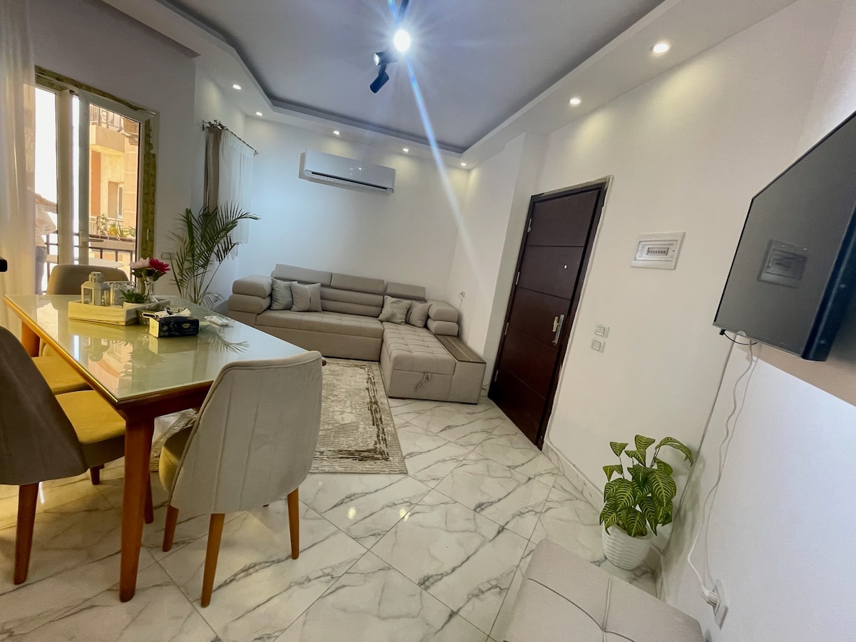 Pagsundo sa Airport LIBRE Para sa booking na 4 na gabi at higit pa 5 minutong lakad lang ang layo mula sa pasukan ng maringal na pyramids Gate , ang yunit na ito ay matatagpuan sa isang bagong itinayong gusali, na matatagpuan sa isang tunay na lokal na kapitbahayan na humihinga sa buhay at pagiging tunay ng Cairo, habang tinitiyak ang isang ligtas na karanasan.. Sa tunay na sulok na ito, pinapanatili ng mga kalapit na kalye ang kanilang tradisyonal na kagandahan, kahit na hindi pa sila nakabukas. Makakakita ka ng mga kabayo at kamelyo sa kalye