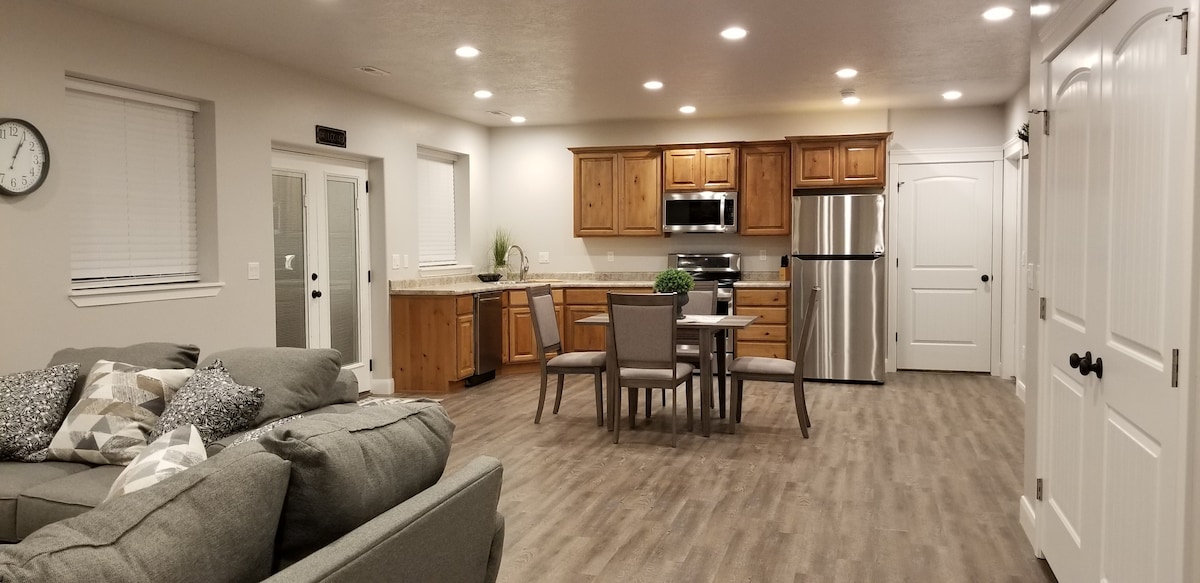 Spacious 2,000 sq ft private 3BR suite sleeping up to 8. Full basement with 1 bathroom, private entrance, and bright living spaces — ideal for families, hospital visits, and small groups. Location Just off I-15 — 30 min to Provo & SLC, 3 mi to Lehi PCH. Near parks, outlets, and restaurants. The space Private entrance, full kitchen, comfy beds, fast Wi-Fi. Light household sounds upstairs 7 AM–10 PM. Not suitable for parties or events. Guest access Entire private suite with separate entrance.