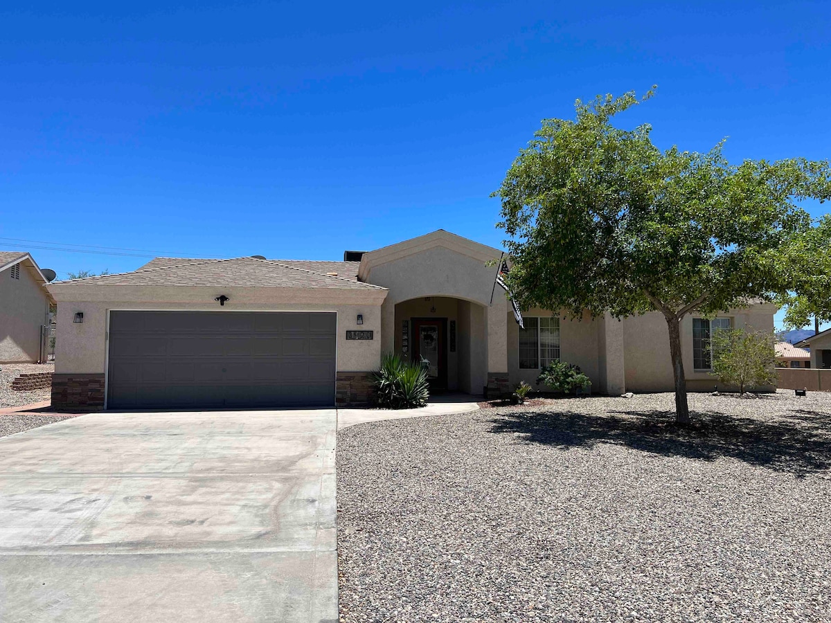Bagong Remodeled Maganda 3 kama 2 bath single story cul - de - sac home 7 Minuto mula sa Lake handa na para sa iyo upang makapagpahinga at gumawa ng mahusay na mga alaala. Sa pagdating mo, mapapansin mo ang malaking paradahan ng RV/Boat sa gilid ng tuluyan. Malapit ang tuluyan sa palengke at sa lugar ng Downtown Havasu na may magagandang restawran. Habang ikaw ay naglalagi maaari mong tangkilikin ang mga masasayang laro tulad ng Large Connect 4, Large Jenga, at ang Ring Game. May panloob na labahan na may ice maker. Ang bakuran sa likuran ay may BBQ at covered patio.