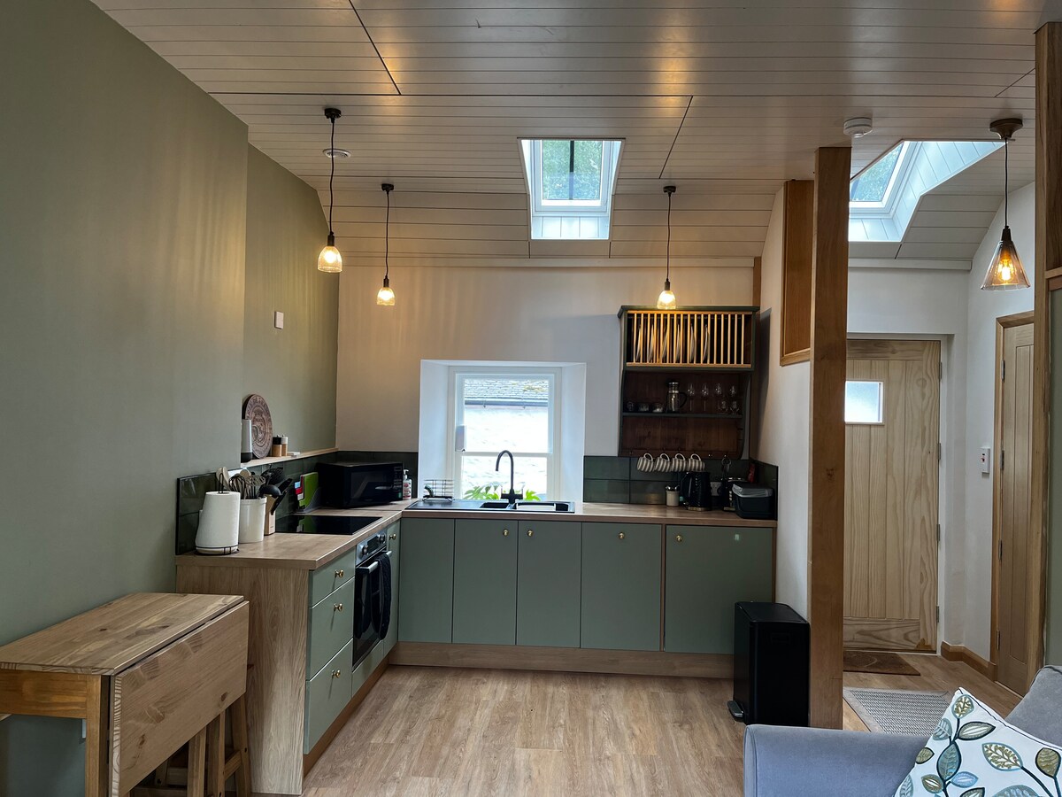 Recently converted blacksmith's workshop, now a comfortable architect-designed open-plan apartment with bedroom, shower-room, modern kitchen and programable under-floor heating. There is a unique feature light created by Scotland’s “Blazing Blacksmith”. It is a detached stone-built dwelling in its own walled-drive with parking space and mounted charger for electric cars. Located in attractive rural Perthshire village (13 miles from Dundee) close to Cairngorms, Angus Glens, Perth and Dundee.