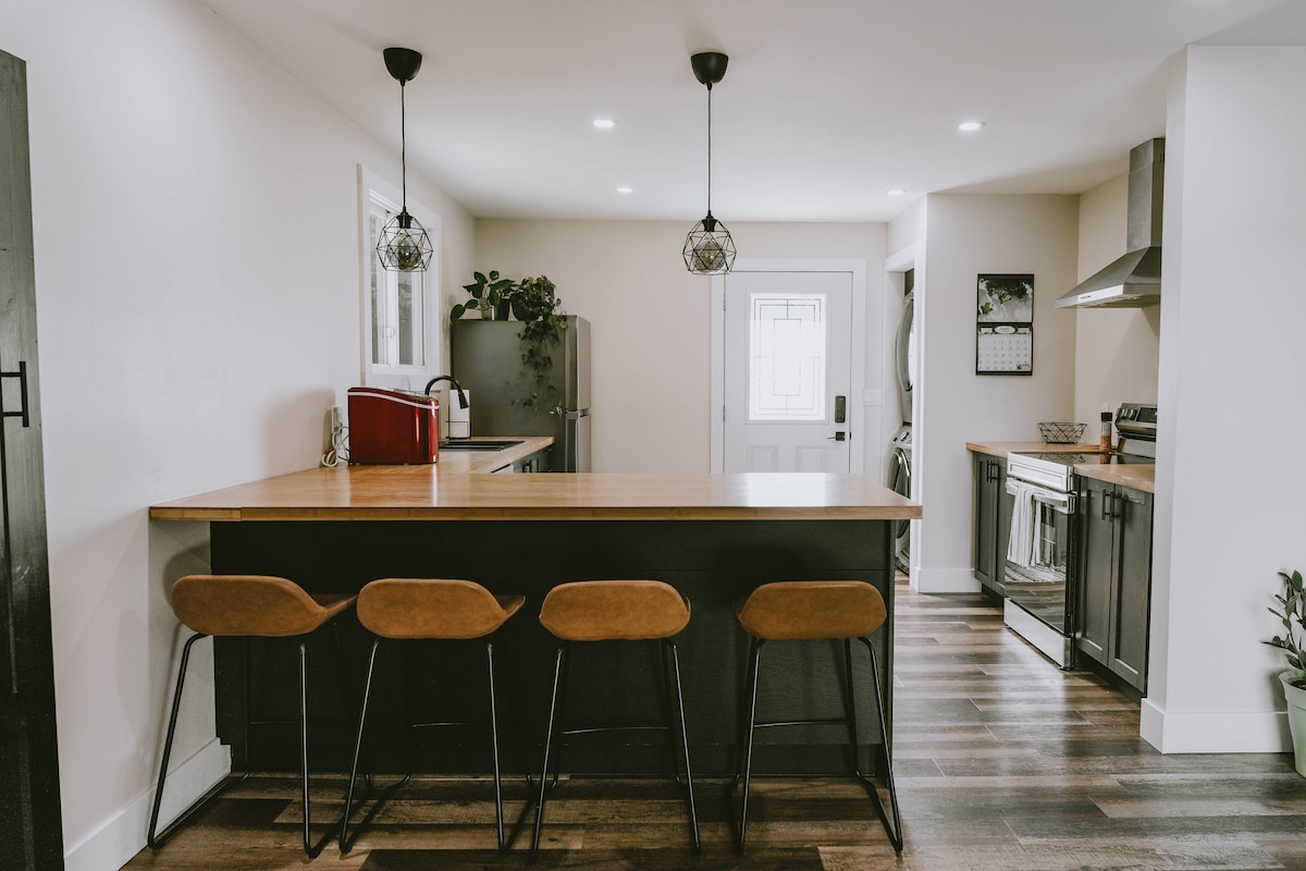 Welcome to ‘Birch Tree Abode’. A unique way to unwind after a day in lunenburg county.Situated between Lunenburg and Mahone bay. Minutes from either. This bunkie’ is situated amongst the trees, with comfortable deck to enjoy the beginning/end of your adventures around the South Shore. A beautiful open plan living space, high end bathroom, all rustically finished . 400sq ft-this is slightly larger than a ‘tiny home’, however minimal space 4 storage/luggage ,also note 5.10 ceiling in bedroom area