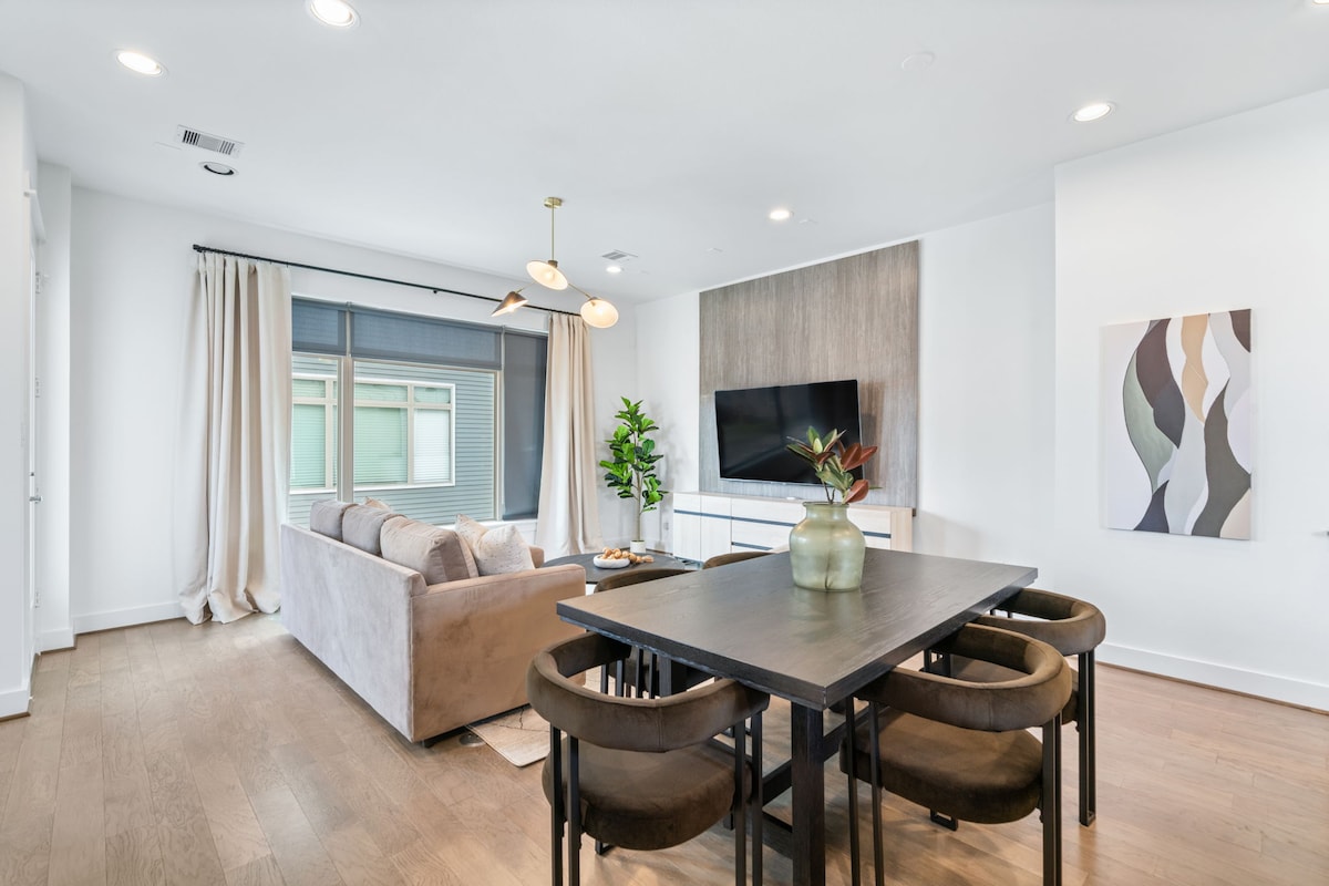 Perpekto para sa mga grupo o pamilya, komportableng nagho - host ang moderno at eleganteng townhome na ito ng hanggang 10 bisita. May 3 maluwang na silid - tulugan, 3.5 paliguan, at 5 higaan, nag - aalok ito ng maraming lugar para makapagpahinga at makapagpahinga. Ang open - concept na sala ay naka - istilong kagamitan, na lumilikha ng isang magiliw na lugar para sa lahat na magtipon. Matatagpuan 5 minuto lang mula sa downtown Houston, malapit ka lang sa pinakamagagandang restawran, bar, at libangan na iniaalok ng lungsod.