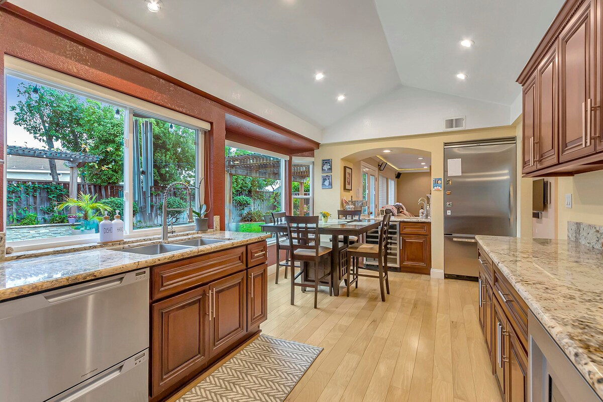 Magrelaks sa estilo sa puso ng Silicon Valley. Nag - aalok ang aming likod - bahay ng mapayapang bakasyunan, na kumpleto sa mga puno na may prutas at ilaw sa paligid. Naghihintay sa loob ang mga modernong kaginhawaan, mula sa mga bagong kagamitan, high speed internet, executive office, at malaking kainan. Sinusuportahan ang iyong mga paglalakbay sa pagluluto sa pamamagitan ng kusinang kumpleto sa kagamitan at sa aming mga komplimentaryong pagkain. Sa proteksyon ng ADT at mapagbigay na paradahan, ang kaginhawaan ay ibinibigay. Handa na ang lahat sa isang tahimik na kapitbahayan, ilang minuto ang layo mula sa mga tech hub at entertainment.