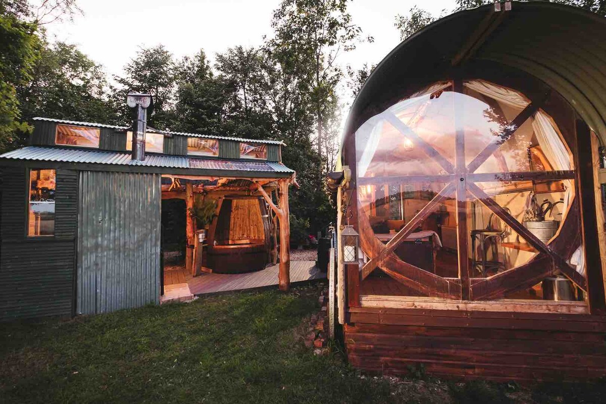 Wagon in the Woods & Wine Barrel Hot Tub