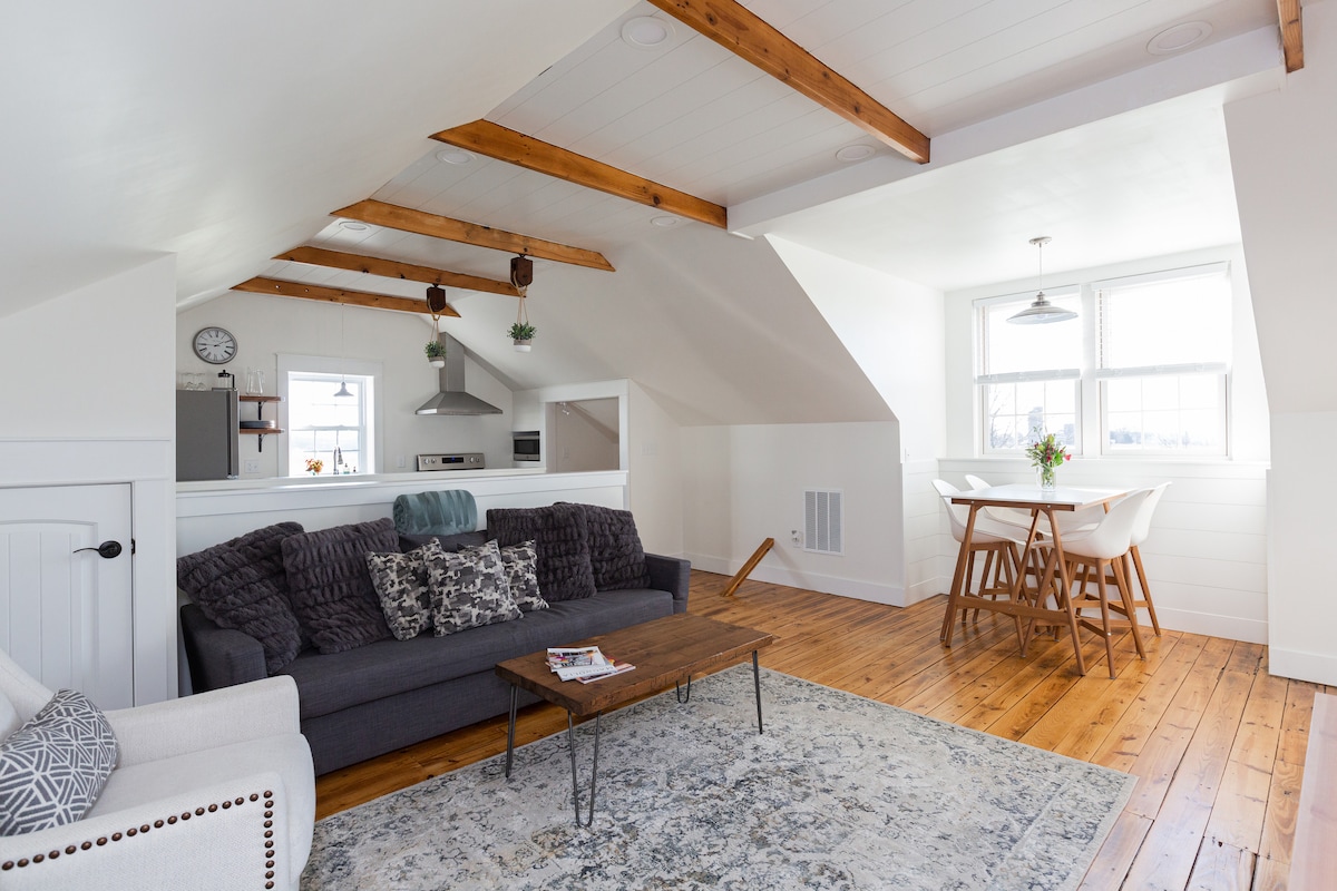 The Carriage House is the second floor of our cedar stables that was turned into an apartment years ago. It has been completely redone and professionally decorated to make it a cozy + luxe retreat with beautiful views. While we no longer use the stables to house animals we still keep a few head of cattle + sheep in the pasture for your enjoyment. The wall of windows along the back of the apartment offer you the most stunning views of the surrounding farmland and an unforgettable sunrise.