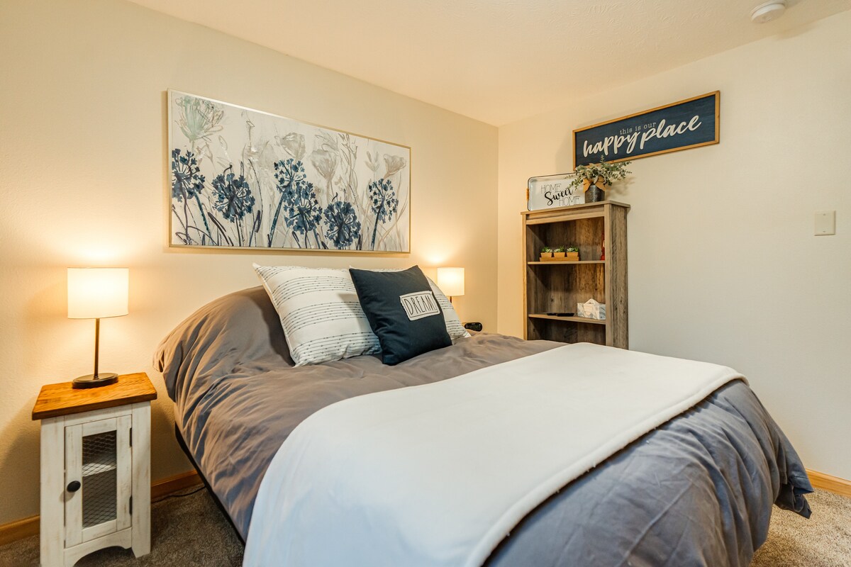 Ang Cozy Green Getaway sa North Bismarck! Mainam ang bakasyunang ito para sa mga mag - asawa, solo adventurer, o business traveler. Magrelaks sa queen bed o manood ng mga paborito mong palabas sa isa sa dalawang Roku TV. Ang kumpletong kusina ay may lahat ng mga pangunahing kailangan, habang ang mga berdeng accent ay lumilikha ng isang nagpapatahimik na vibe. Nagtatampok ng banyo, common area, gym, at komportableng patyo, na perpekto para sa mga nakakarelaks na umaga o gabi. Maginhawang matatagpuan sa North Bismarck, ito ang perpektong lugar para sa susunod mong pamamalagi. I - book ang Cozy Green Getaway ngayon!