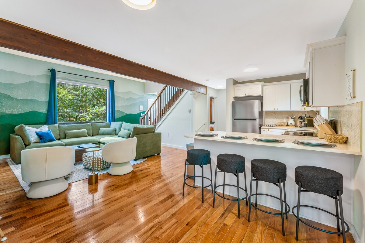 Magandang marangyang townhouse para sa hanggang 8 bisita, na may 2 kuwarto, 2.5 banyo, kumpletong kusina, opisina, loft, at deck na may ihawan at tanawin ng mga shared na bakuran na parang parke. Mamamangha ka sa mga maliwanag na interior, skylight, tanawin ng bundok, at malaking shower na gawa sa marmol. Ilang hakbang lang mula sa Shawnee Mountain at maikling biyahe papunta sa Shawnee Inn & Golf, Bushkill Falls, Delaware Water Gap, mga outlet, at kainan. Kasama ang almusal, mga meryenda, at de-kalidad na pangangalaga sa katawan—perpekto para sa mga pamilya, magkarelasyon, o grupo. May available na dekorasyon.