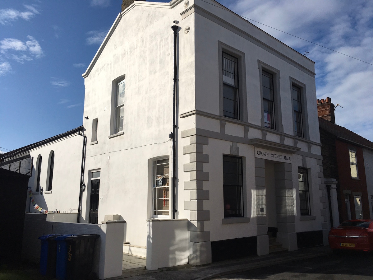 Ang malaking studio na ito ay may sariling pribadong koridor at banyo, na mapupuntahan ng sarili nitong pasukan sa isang bagong na - convert na Grade 2 na nakalistang dating teatro. May tv area, dining area, bedroom area at kitchenette area (refrigerator, microwave, toaster at kettle), gumagawa ito ng compact base para sa pagtuklas sa Suffolk at sa Norfolk Broads. Matatagpuan sa lumang sentro ng bayan, 5 minutong lakad mula sa mataas na kalye, at 15 minutong lakad mula sa istasyon at beach. Paumanhin - hindi angkop para sa mga batang wala pang 8 taong gulang.