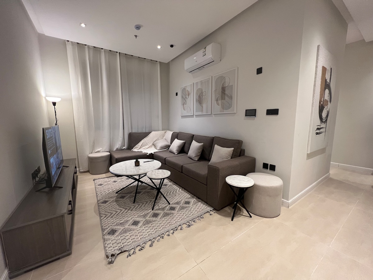 Tumuklas ng pambihirang tuluyan sa komportableng apartment sa gitna ng Khobar. Maraming amenidad ang apartment: 1. Matalino at ligtas na pagpasok sa pamamagitan ng smart door lock. 2. Malaki at komportableng sala para sa pamilya. 3. Malaking pinagsamang kusina na may mga kagamitan sa pagluluto at kagamitan. 4. 4K smart screen. 5. Mabilis na koneksyon sa internet ng 5G. 6. Pribadong paradahan. Bukod pa rito, malapit ang apartment sa maraming atraksyon, kabilang ang: 1. Bahrain Bridge - Sa loob ng 5 minuto. 2. Al Rashed Mall - 10 minuto. 3. Waterfront - 5 minuto.