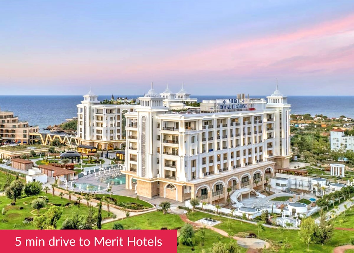 Mag - enjoy ng simple at komportableng pamamalagi sa tahimik na lugar na ito na matatagpuan sa gitna. Ang aming bahay, na matatagpuan sa lugar ng hotel (Merit Royal - Merit Cristal Cove - Merit Park - Kaya Palazzo), ay malapit sa mga merkado, bangko at parmasya. May gym. Nasa gitnang lokasyon ito kung saan maaari mong mabilis na maabot kahit saan sa pamamagitan ng kotse. Kung hindi ka umarkila ng kotse, 250 metro ang layo nito mula sa kalye kung saan dumadaan ang mga minibus. May 1 double bed ang bahay, sofa na puwedeng gawing bed at 1 single bed.