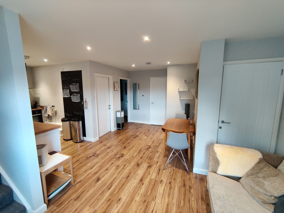 Bumalik at magrelaks sa tahimik at naka - istilong tuluyan na ito. Pribadong annexe flat na may sariling access. Buksan ang plano ng kusina at living area. Hiwalay na lugar ng kainan. Ang 1 silid - tulugan na may mga zip link bed, ay maaaring maging twin o superking. Banyo na may shower. Pasilyo. Access sa washing machine, tumble dryer at airer ng damit kapag hiniling. Naka - lock na imbakan para sa mga push bike kapag hiniling. Sa labas ng patyo.