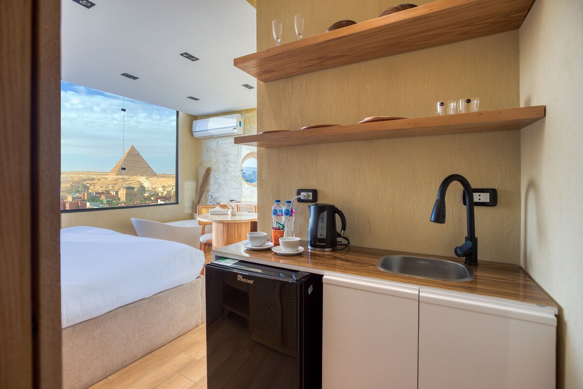 Matatagpuan isang bato lang ang layo mula sa pasukan ng lugar ng mga piramide ng Giza, masisiyahan kami sa mapayapang timpla ng modernong kagandahan at makasaysayang kadakilaan. Nagpapatuloy ka man sa panorama sa rooftop o nasisiyahan ka man sa kamahalan ng mga pyramid mula sa iyong sariling pribadong balkonahe, ang bawat sandali ay nagiging koneksyon sa kahanga - hangang nakaraan at masiglang kasalukuyan ng Egypt. Nagsisimula ang iyong paglalakbay sa mga kababalaghan ng Giza sa sandaling pumasok ka sa aming maingat na idinisenyong tuluyan.