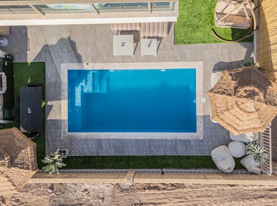 sea house Idinisenyo sa boho‑chic at malayang estilo, ang villa ay may pinapainit na pool (sa ika‑1 palapag), dalawang kuwartong may air condition, dalawang banyong may shower at inidoro, at kusinang kumpleto ang kagamitan. Sa hardin, may maaliwalas na lugar na may mga upuan at lugar para sa barbecue, pati na rin ping‑pong table.