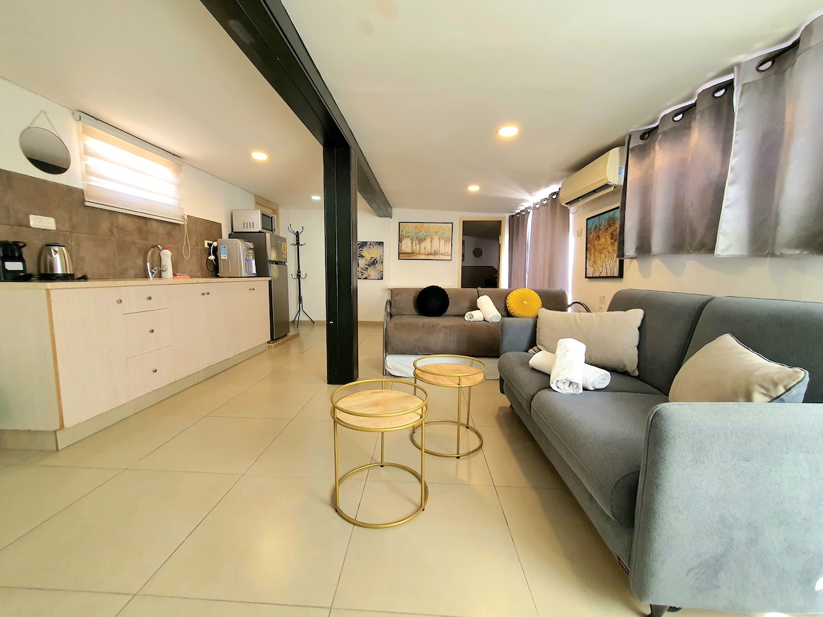 Oo, may dimensyon!!! Kailangan mong bumaba nang isang palapag gamit ang hagdan para makarating doon. Boutique vacation suite sa pinakaprestihiyosong kapitbahayan ng villa sa Eilat. May silid - tulugan at malaking sala at balkonahe. Na - renovate at idinisenyo bilang tahimik at tahimik na B&b at partikular na angkop para sa mga mag - asawa at pamilya. Makikita sa loob ng maigsing distansya mula sa Palm Beach at Mosh Beach. Ang red sea retreat ang perpektong solusyon para sa iyong mapayapang bakasyon. Mas mahusay na ipinapaliwanag ng aming mga bisita kaysa sa amin sa kanilang mga komento🙏🏻 at pansamantala naming ginagawa ang lahat ng makakaya para gawing kasiya - siya ang iyong bakasyon.