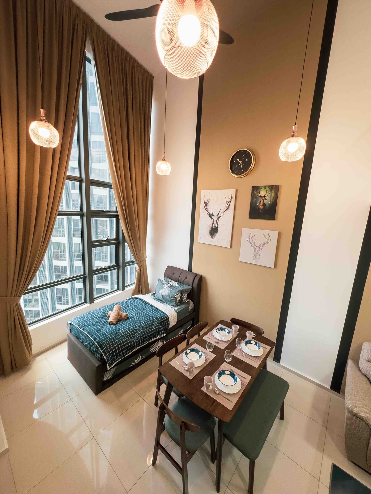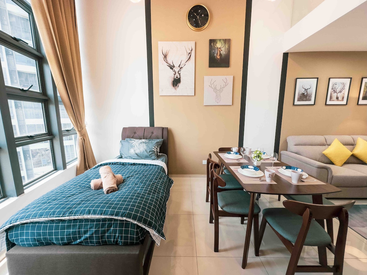 Ang aming Grand Loft ay puno ng lahat ng uri ng mga amenidad at pasilidad na kakailanganin mo! Nilagyan kami ng mga de - kalidad na muwebles, yunit ng libangan (Karaoke) at katangi - tanging pagtatapos na nagbibigay ng hindi lamang higit na halaga kundi pati na rin ang iyong karanasan sa pamamalagi rito. Matatagpuan kami 15 minuto lang ang layo mula sa CBD, 5 hintuan ang layo mula sa Bukit Bintang (Pavillion) at 6 na hintuan ang layo mula sa KLCC sakay ng tren. Madiskarteng matatagpuan kami na may 4 na minutong lakad papunta sa mall papunta sa istasyon ng MRT sa lv 1