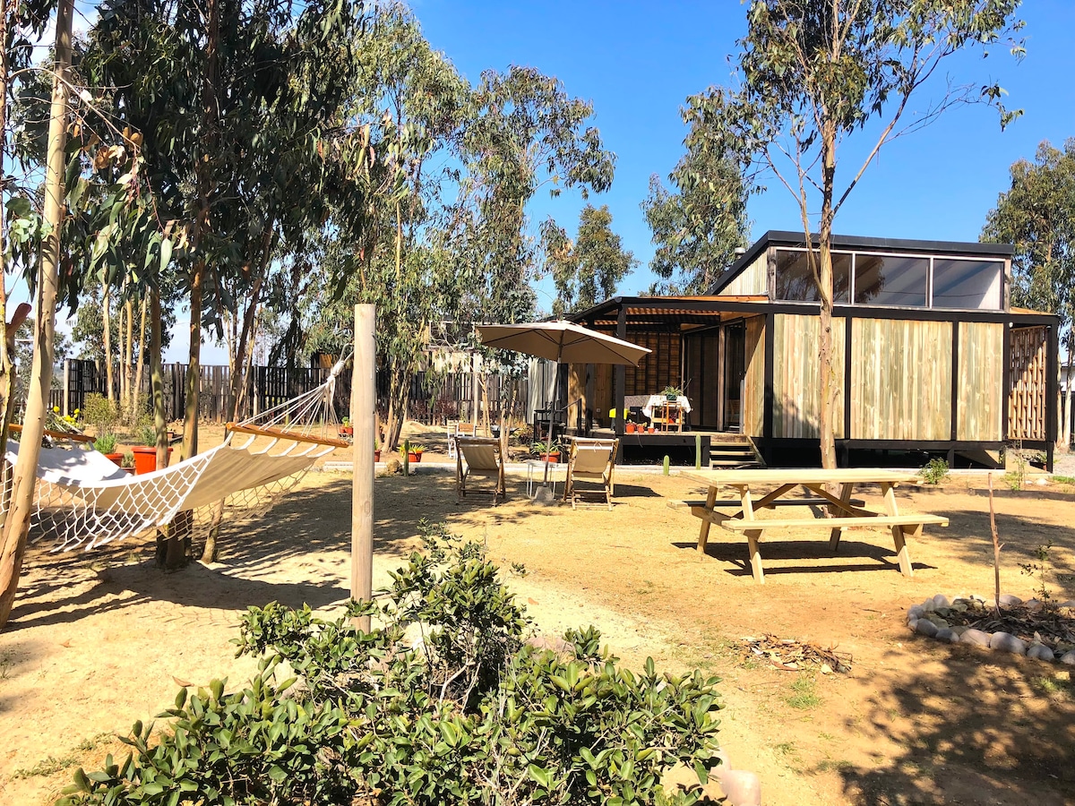 Cute at maaliwalas na plot sa Algarrobo 5 minuto sa pamamagitan ng kotse mula sa beach, 15 minutong paglalakad. Tahimik at natural na lugar. Ang pangunahing cabin ay may sala at silid - kainan, Bosca, smartTV, wifi, built - in na kusina na may washing machine . Dalawang silid - tulugan at isang buong paliguan. May outdoor cabin na may dalawang naka - attach na kuwarto at full bathroom. Ang balangkas ay may pool sa deck, quincho para sa barbecue na may garland ng mga ilaw, mga laro ng mga bata, bahay sa isang puno. May pagbaba ito sa kantong iyon. Eksklusibong paggamit.