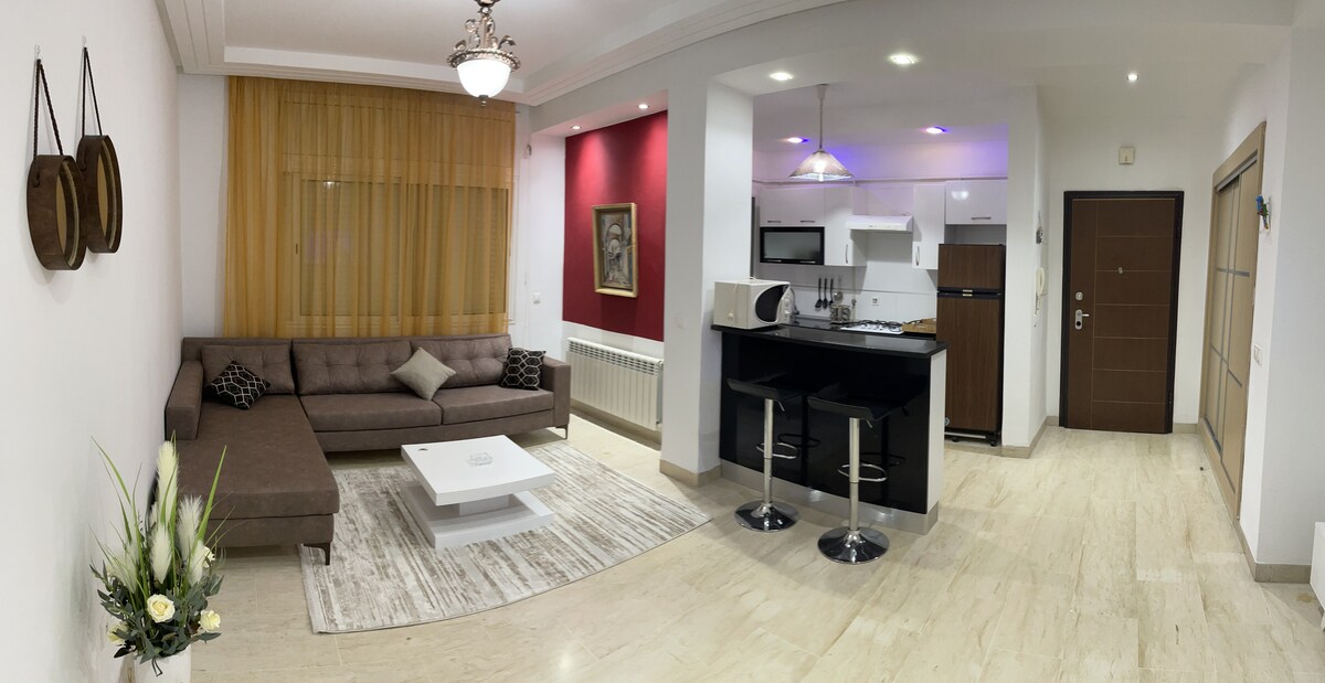 *ISANG silid 🛌 - tulugan na may king size bed , work space laptop friendly at isang dressing * ISANG banyo 🛁 na may bath tray, kandila, likidong sabon, toilet roll at mga sariwang tuwalya * Kusinang kumpleto sa kagamitan na may mga pangunahing kailangan sa almusal🍳, home made Tunisian 🇹🇳 spices upang gumawa ng masarap na pagkain 🥘 * Bumubukas ang kusina sa isang maluwag na sala na may sofa na hugis L kung saan maaaring tangkilikin ng tou ang panonood ng iyong mga paboritong pelikula 🎥 * Isang malaking balkonahe kung saan maaari mong tangkilikin ang afternoon tea 🍵 na may tanawin (nasa 🧺 cornes ang washing machine)
