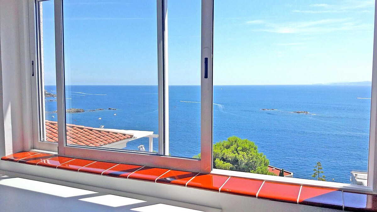 Komportableng studio at patyo na may tanawin ng dagat, 5 hakbang mula sa beach