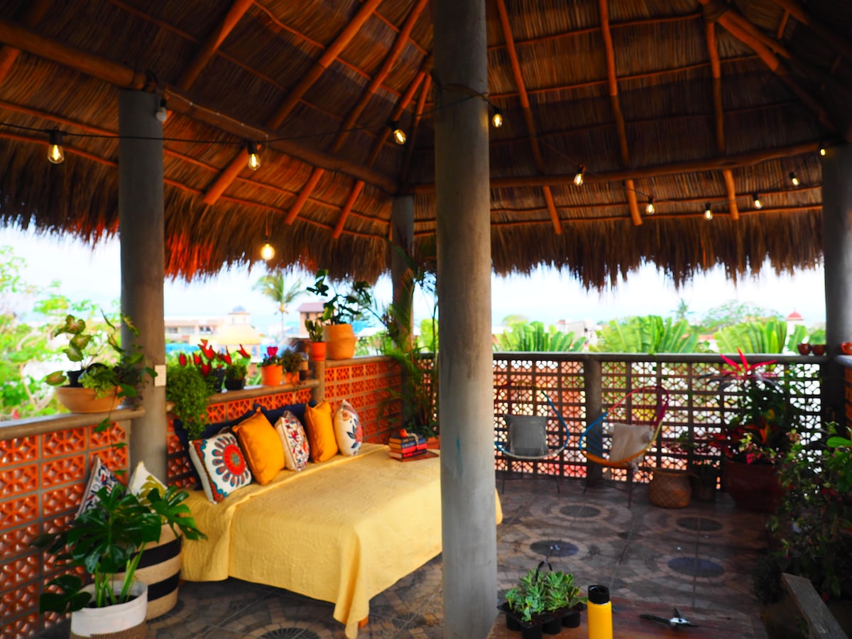 Coqueto Lodge estilo boho rodeado de un verdoso jardín tropical, hamacas, camastros y sillas playeras. Todo un buen comienzo para tu aventura vallartense. Ubicado en el Fraccionamiento Fluvial, una de las zonas más céntricas y exclusivas del Puerto, a tan solo 15 minutos a pie de la playa, así como de los centros comerciales La isla, Plaza Península, Plaza Caracol, La Comer y el Pitillal.