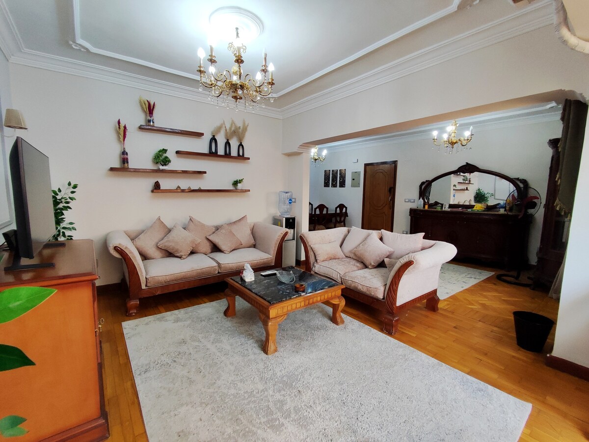 Vintage flat since 1946 Mixed with Modern Comfort in a prime location only 9 mins away from the Airport. King size bed plus Sofa bed. Although there is no Elevator, yet we provide free luggage assistance upon check in and out. Walking distance for 2 underground stations Perfect for couples, solo travelers. You will find luxurious gym, pharmacy and supermarket mins away. 10 minutes walking to El Korba District full of fine restaurants, coffee shops and shopping