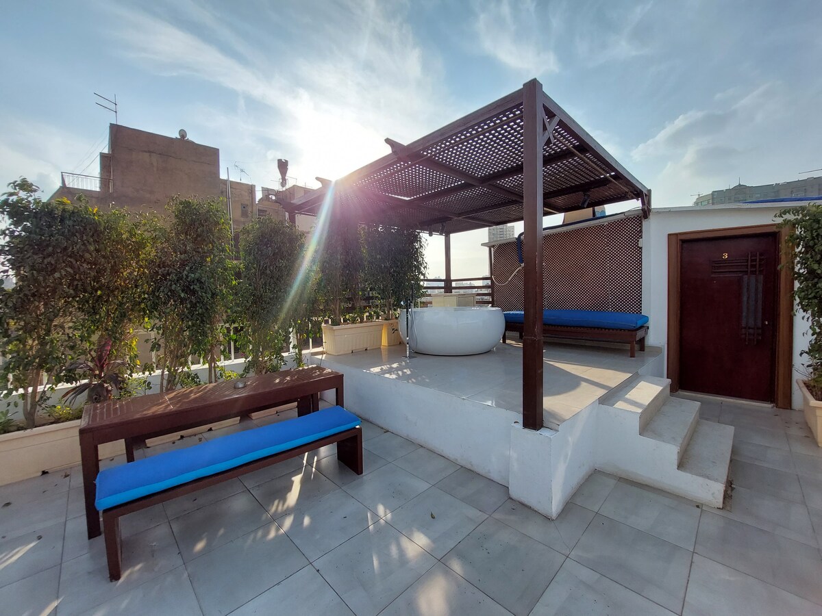 Mag‑enjoy sa komportableng pribadong studio sa gitna ng Downtown Cairo na nasa isa sa mga pinakaligtas na kapitbahayan sa lungsod. Magrelaks sa balkonahe na may magandang tanawin ng lungsod o magpahinga sa rooftop jacuzzi na may mainit at malamig na tubig, perpekto para sa kape, pagbabasa, o pagpapahinga sa gabi. 15 minutong lakad lang sa Tahrir Square, 10 minuto sa Nile, at malapit sa mga supermarket at lahat ng pasilidad. May dalawang flexible na higaan ang studio para sa hanggang 4 na bisita.