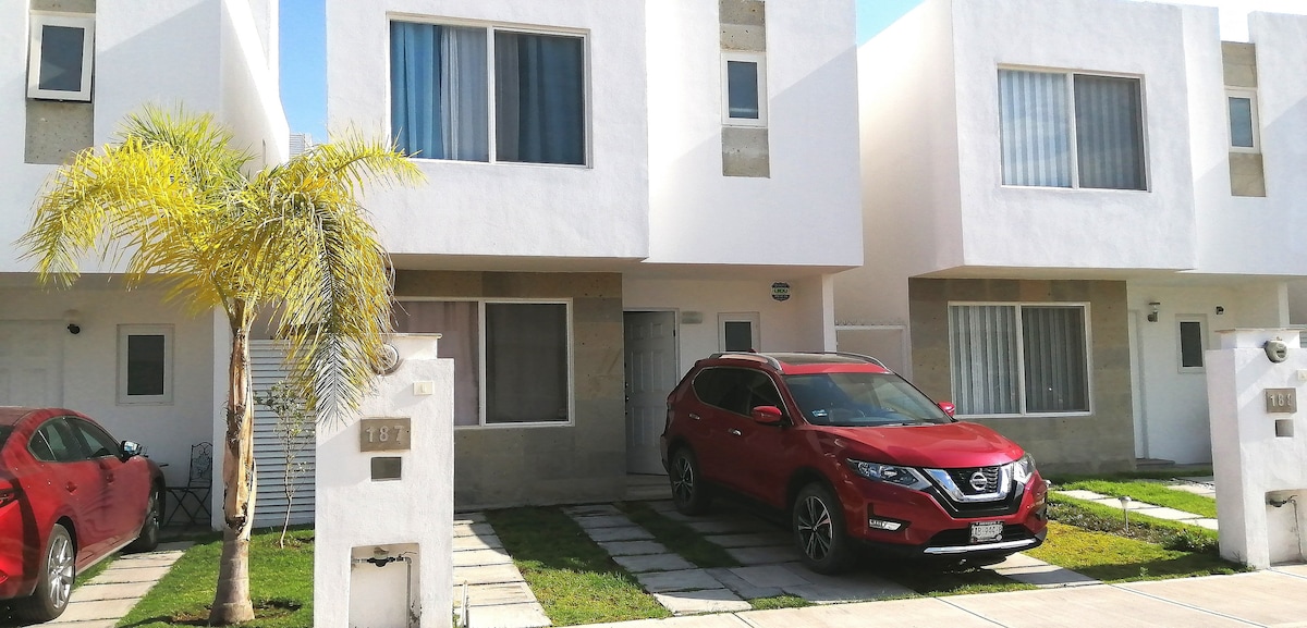 Magandang bahay na matatagpuan sa timog ng Aguascalientes, isang mahusay na lugar kung saan maaari mong tangkilikin ang mga lugar ng turista at magpahinga, alinman sa paglalakbay para sa trabaho, kasama ang pamilya, o mga kaibigan, 3 min mula sa Sams Club at Aurrera, 10 min mula sa Fair mula sa San Marcos, 15 min mula sa sentro ng lungsod at malapit sa paliparan. Nasa pribadong preserve ito na may 24 na oras na seguridad at mga common area, laro, gym, at pool. Mayroon din itong smart lock.