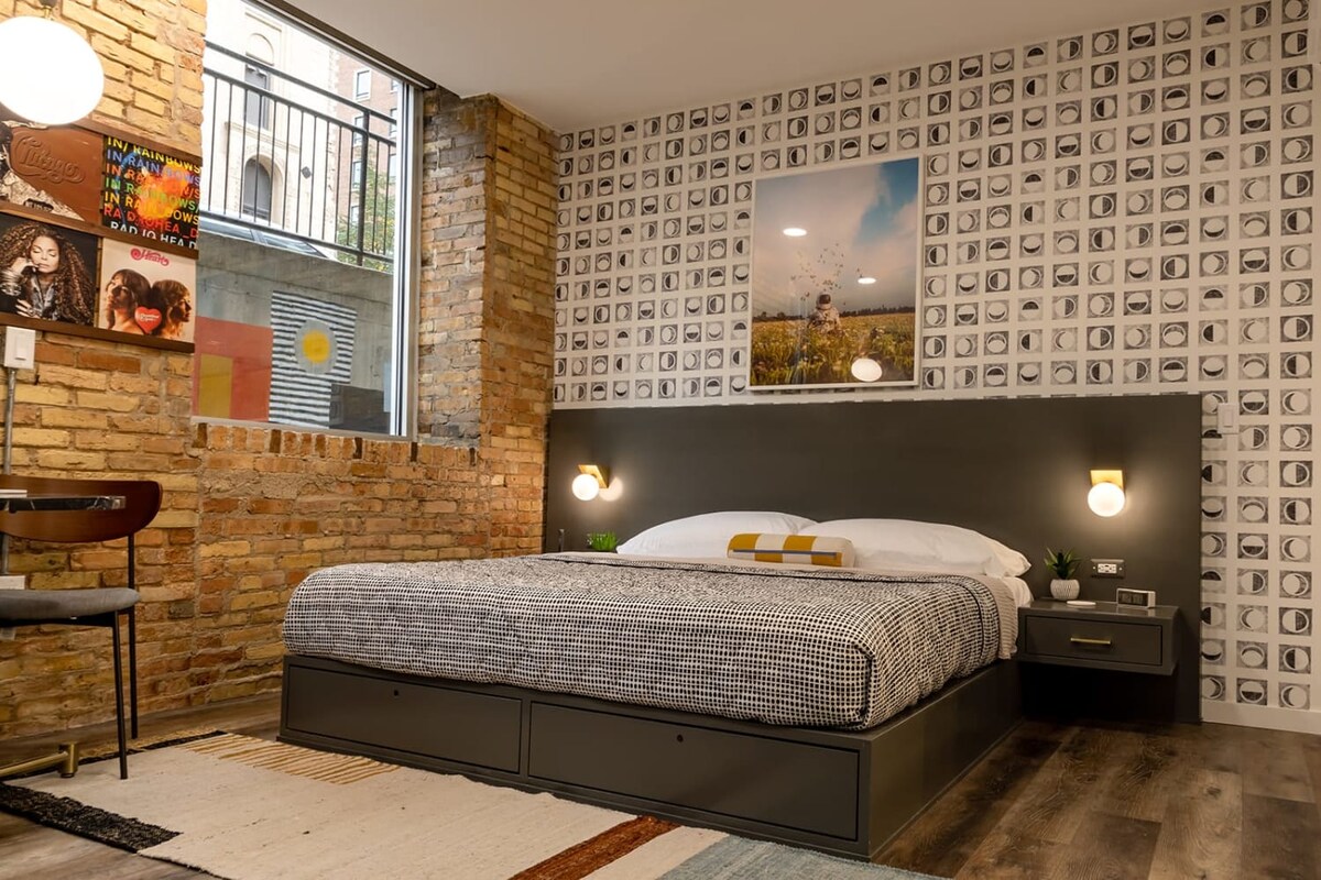 Welcome to your stylish Milwaukee retreat! This large corner studio loft blends historic Cream City charm with modern comfort. Soaring 15-ft ceilings, exposed brick, and oversized windows create a bright, open space. Enjoy a spacious king bed, fully stocked kitchen, and free off-street parking — rare in this neighborhood. Walk to the Third Ward, Walker’s Point, and Milwaukee’s best restaurants, breweries, shops, and the vibrant riverfront. Perfect for both work and play.