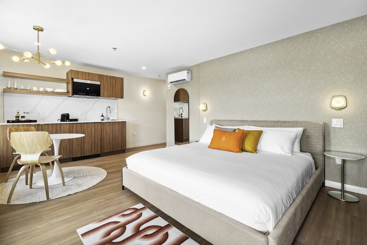 Masiyahan sa isang nakakarelaks na gabi sa aming mga pirma na "lumulutang" na platform bed, na kumpleto sa mga maginhawang charging port at marangyang bedding. Ang aming mga minimalist - inspired na kuwarto ay maingat na idinisenyo upang maibigay ang lahat ng mga pangunahing kailangan mo - at walang hindi mo ginagawa - sa panahon ng iyong pamamalagi sa Portland.