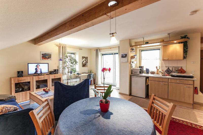 Attic apartment 20 minuto sa pamamagitan ng kotse mula sa Potsdam at Berlin at 30 minuto sa pamamagitan ng tren mula sa BER. Maluwang at kumpletong kagamitan sa designer na kusina*, banyo na may Agape Vieques bathtub at katumbas na lababo * , silid - tulugan na may 2.70 m na higaan * , gym ay maaaring gamitin bilang pangalawang lugar ng pagtulog. Narito ang isang 1.80 m double bed*projector na may pre - install ng app para sa NETFLIX, Disney + at Amazon Prime Login, mga laruan, supermarket na may panaderya at butcher drink market* mga swimming lake at hiking