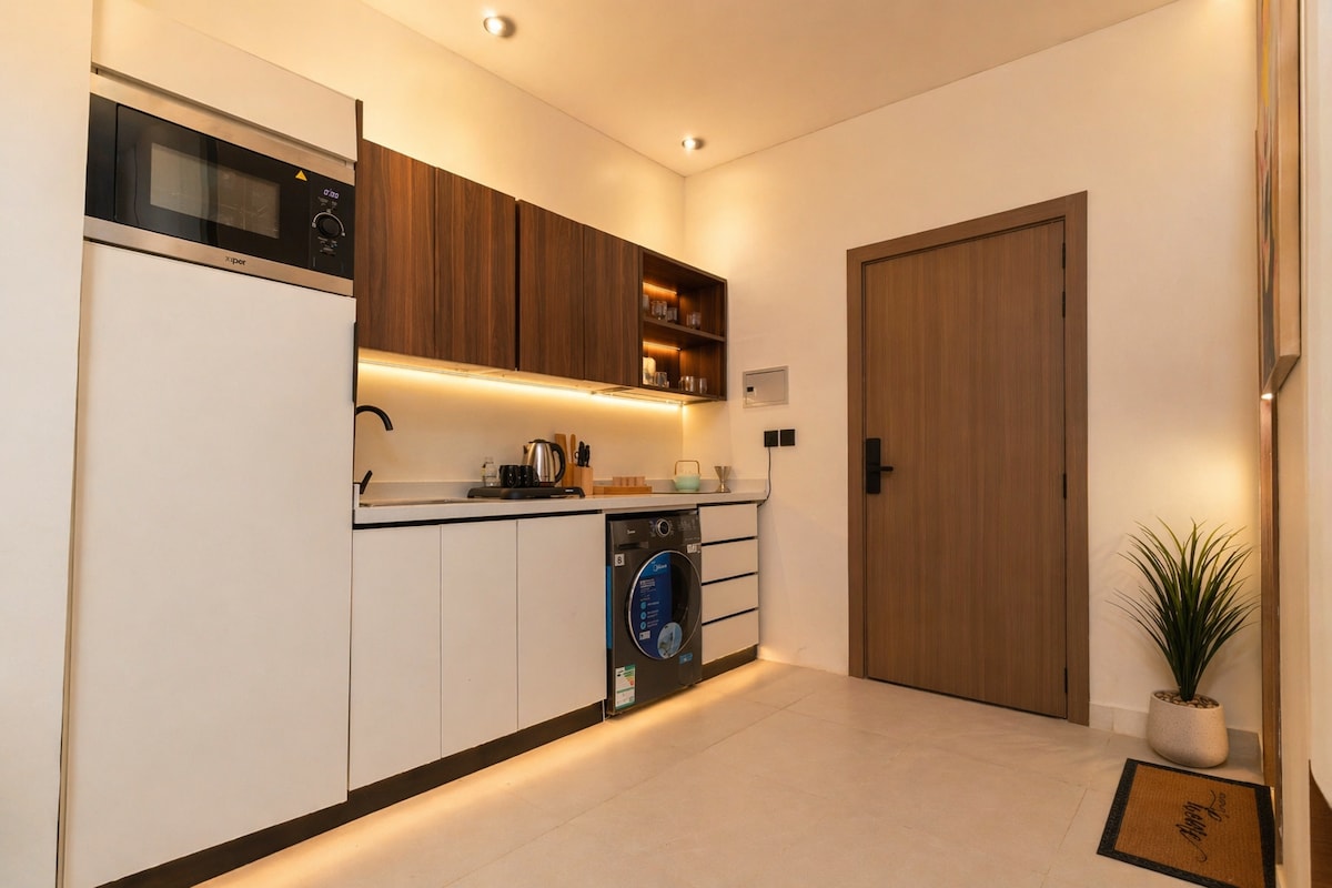 Marangyang penthouse na may sariling pasukan na binubuo ng dalawang kuwarto, sala, sinehan, lugar na may mga upuan sa labas, at dalawang banyo na kumpleto sa shampoo, tsinelas, tuwalya, at tisyu. •Matatagpuan sa Rasf Compound – Qurtubah District Parehong nagbibigay ng access sa lahat ng pangunahing platform ang TV sa sala at ang cinema projector (Netflix, YouTube, at marami pang iba). Nasa magandang lokasyon ang property na malapit sa: •Roshn Front (Riyadh Front) – 6 na minuto • King Khalid International Airport – 15 minuto