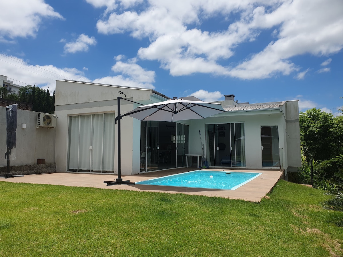 Bahay sa tabi ng Lagoa da Garibaldi, na may malaking balkonahe, solar‑heated na swimming pool, malawak na harding may puno, property na may bakod at elektronikong gate, kalan na pinapagana ng kahoy, gourmet space at integrated na sala, pool table, TV na may mga open at closed channel, Wi‑Fi Zone, at 2 kuwartong may double bed. Kumonekta sa masayang kalikasan ng rehiyon. Bahay na may mga alarm at external monitoring camera. Kalimutan ang iyong mga alalahanin sa tahimik at maluwang na lugar na ito.