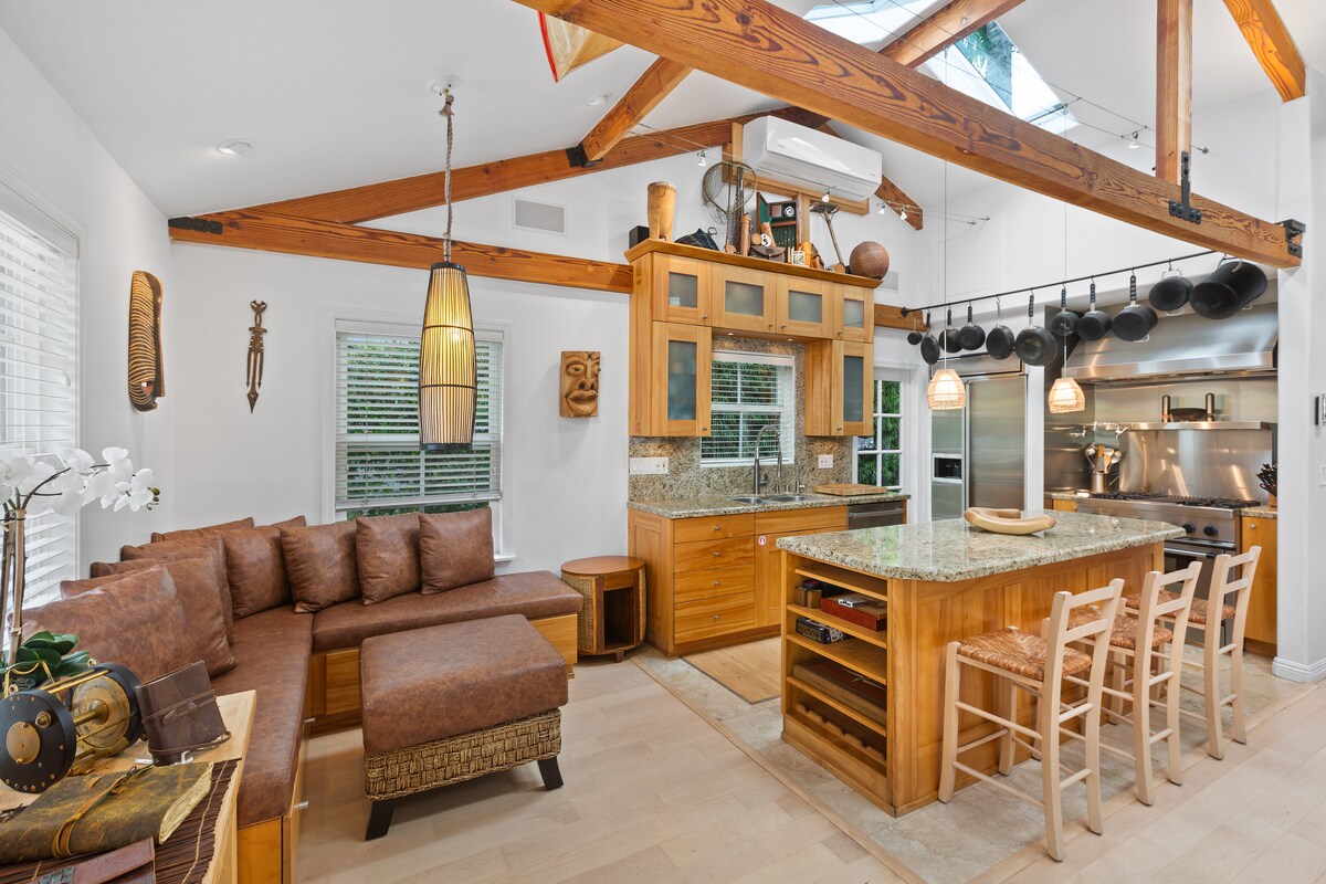 Paghiwalayin ang gate na pasukan sa pribadong guest suite na sumasakop sa mas mababang antas ng tuluyan na pinangalanang Treehouse of Love (walang pinaghahatiang lugar). Mag - enjoy sa likod - bahay! 1 Komportableng queen bed at 1 komportableng sofa, 65" TV, refrigerator/freezer, microwave, Nespresso coffee machine, full bath na may magandang shower, at maraming set ng patyo para ma-enjoy ang luntiang tropikal na bakuran at sikat ng araw. Panlabas na surf shower at duyan para makapagpahinga. Malapit sa karagatan, parke, at magagandang lokal na restawran/bar.