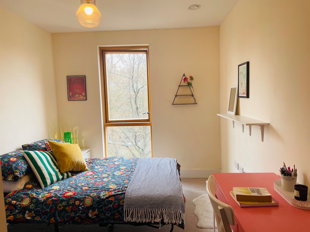 Binubuo ang accommodation ng double bedroom na may mga French door na bumubukas papunta sa magandang malaking hardin. May kusinang kumpleto sa kagamitan at maliit na banyong may walk - in shower. Kasama ang broadband, TV, refrigerator, washing machine at patuyuan. Ito ay tungkol sa 50 yarda mula sa istasyon ng Egham na may mga regular na tren sa London, ang paglalakbay na tumatagal ng tungkol sa 40 minuto. Ang tren ay papunta sa Waterloo Station na napakalapit sa London Eye at Westminster, na may Buckingham Palace, St James Park, at Trafalgar Square na maigsing lakad ang layo. 5 o 6 na milya ang layo ng Heathrow Airport. Ang Egham ay isang maliit na bayan, ngunit mayroon itong ilang makasaysayang interes na ang Magna Carta ay nilagdaan sa Runnymede sa kalsada sa tabi ng ilog noong 1215. Sa hindi kalayuan ay ang Windsor castle at Eton (kung saan nag - aral ang mga prinsipe na sina William at Harry, at David Cameron). Mayroon ding ilang kaibig - ibig na kanayunan sa paligid at kaibig - ibig na paglalakad.