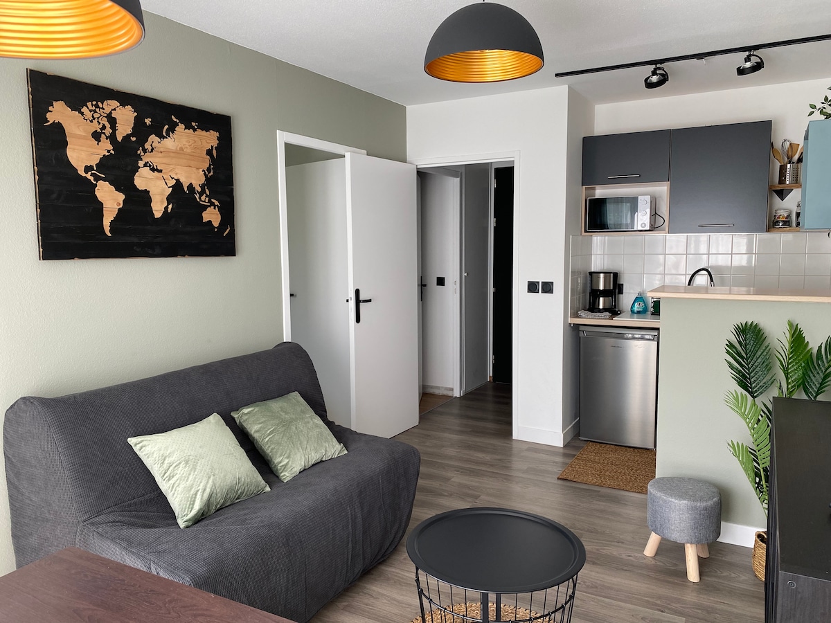 Tangkilikin ang aming studio na may balkonaheng nakaharap sa timog at Balneo bathtub sa Marina. Mayroon itong totoong 160x200 na higaan na may mga linen sheet, Wifi, nakakonektang TV, kusinang may kasangkapang dishwasher, organic bean coffee machine na may grinder, organic na tsaa at sodastream, 1 bote ng sariwang lokal na cider na iniaalok, Wifi. Makakapagrelaks sa banyong may bathtub para sa isang tao. Hiwalay ang palikuran. May libreng paradahan sa ibaba ng gusali.