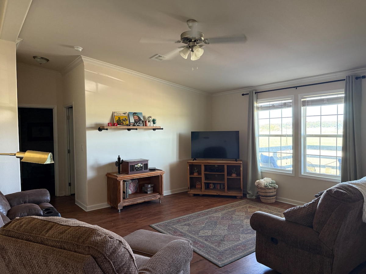 Matatagpuan sa tahimik na kalsada sa kanayunan na 7 milya lang sa hilaga ng Stephenville, nasa lawa at may kahoy na ektarya ang bagong inayos na tuluyang ito. Ang malawak na balkonahe sa gilid ng lawa ay magandang tanawin at mainam para sa paggamit ng umaga at gabi. Isang milya ang layo ng property mula sa Tarleton State University Rodeo Facility at malapit sa Melody Mountain Ranch. May king size na higaan ang dalawang silid - tulugan sa unang palapag. May queen bed sa kuwarto sa itaas at trundle bed sa loft. Lahat ng may kapansanan sa ground floor.