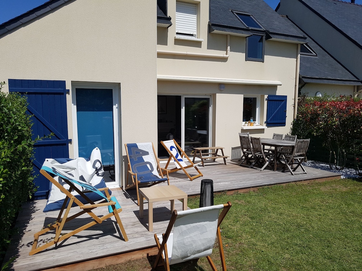 Itinayo noong 2019, ang aking bahay ay matatagpuan sa tahimik na cul - de - sac 750 metro mula sa beach ng Etel body ng tubig at mga tindahan. Nag - aalok ito ng maliwanag na sala na may mapapalitan na sofa,(140x200), kusinang kumpleto sa kagamitan, silid - tulugan na may aparador, kama na 160x200, silid - tulugan na may 2 kama na 90x200, banyong may toilet, labahan. Bago, komportable at malinaw na interior. Bike room. Buksan ang hardin na may timog na nakaharap sa terrace, patyo na may terrace. BBQ. Pribadong paradahan. Isinasaalang - alang ang mga alagang hayop.