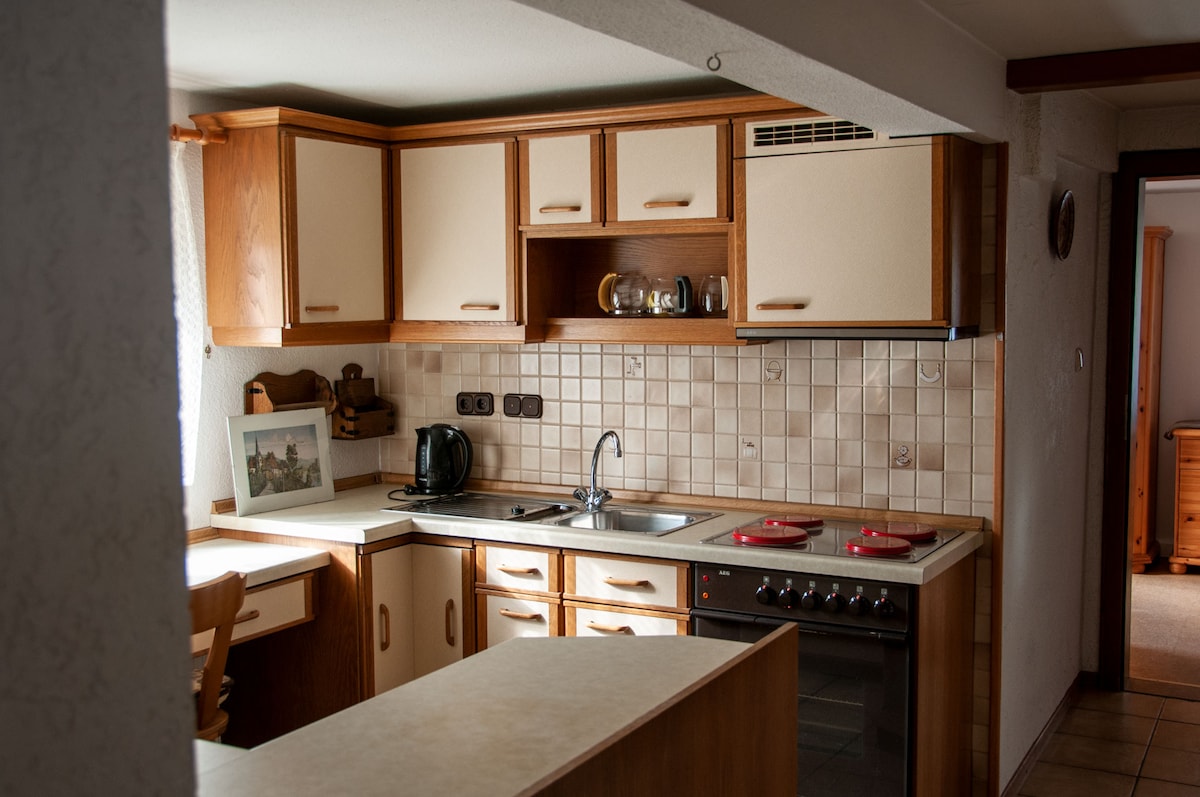 Nakatira ka sa isang makasaysayang gusali, na itinayo noong 1799 ng Princes of Mainz bilang isang pangangasiwa ng panggugubat, sa Rippberg - isang distrito ng pilgrimage town ng Walldürn sa rehiyon ng Odenwald ng Baden. Ganap na naayos ang apartment noong 2022 at iniimbitahan ito para sa maikli at mas matagal na pamamalagi. Dahil sa kapaki - pakinabang na layout na may 3 kuwarto, ang apartment ay angkop para sa maximum occupancy hindi lamang para sa isang pamilya, kundi pati na rin para sa 2 mag - asawa, halimbawa.
