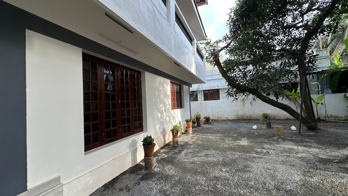 Welcome sa tahimik at komportableng 2BHK guesthouse ko na may kumpletong kaginhawaan at privacy. Nakatago ito sa isang tahimik na kapitbahayan pero nasa gitna ng Ernakulam City. Para sa mga personal kong bisita ito dati, pero bukas na ito ngayon para lang sa mga pamilya at mga bisitang may mabuting asal. Matatagpuan sa pinakamataas na palapag ng pribadong tatlong palapag na gusali ko, komportable ang pamamalagi sa tuluyan. May air‑con ang isang kuwarto, at may dalawang balkonahe na nagbibigay ng magandang natural na liwanag at sariwang hangin. Kinakailangang ibahagi ang KYC bago mag‑check in