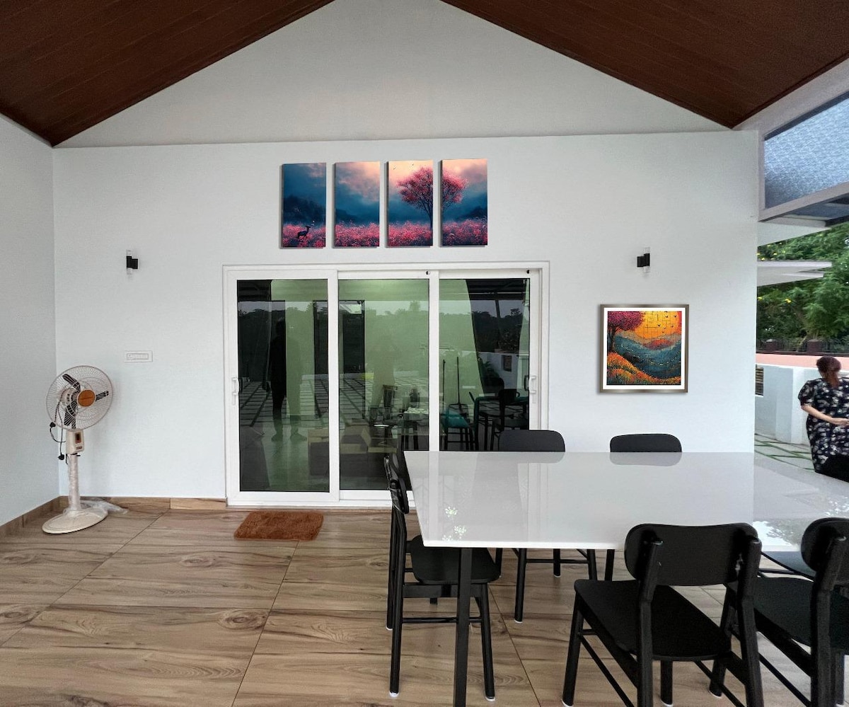 Magrelaks sa natatangi at tahimik na bakasyunang ito. Maluwang na nakadikit na kuwarto na may kusina at lahat ng kubyertos. May Amble Parking, bakuran, swing sa labas, badminton court, AC, geyser, inverter, water purifier, convection oven, blender, washing machine, hood, at hob.