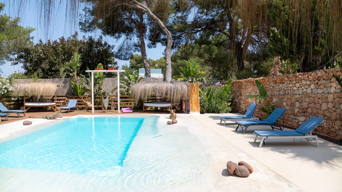 Kaakit - akit, boutique - style na villa na matatagpuan sa isang romantikong berdeng hardin na may mga lumang puno at bulaklak. Sa pamamagitan ng mga terrace, chillout area, at magandang maliit na pribadong pool, nag - aalok ang property ng magandang tuluyan at privacy para sa 8 hanggang 9 na bisita. Lahat ng 4 na silid - tulugan na may AC. Internet: high - speed fiber - optic! Sa loob ng 6 na minutong lakad, makakarating ka sa magandang sandy beach ng Cala Llonga. 4 na minutong lakad lang ang layo ng mga restawran, supermarket, tindahan, at taxi stand. 5 minutong biyahe ang layo ng Ibiza golf o Santa Eularia. Aabutin nang 12 minuto ang biyahe papunta sa Ibiza Town.