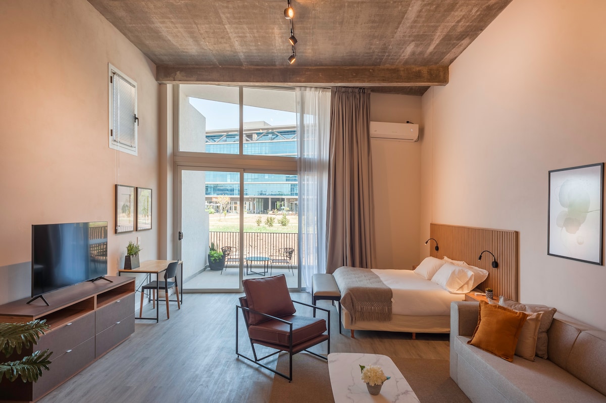 Tuklasin si Pilar sa magandang apartment na ito na matatagpuan sa complex na "Work & Live". Maluwag na double - height studio apartment, na may avant - garde na disenyo at kumpleto sa kagamitan. Sa sandaling pumasok ka, magiging komportable ka. Tamang - tama para sa mahahabang pamamalagi. o pagtatrabaho nang malayuan. Para sa kabuuang kaginhawaan, ang apt ay may pribadong garahe sa parehong gusali. Dahil ang gusali ng mga premium na amenidad ay may napakaluwag na terrace na perpekto para sa pagbabasa o simpleng pamamahinga - mayroon din itong 2 jacuzzi at gym -. Nagtatampok din ang gusali ng laundry at 24 na oras na seguridad.